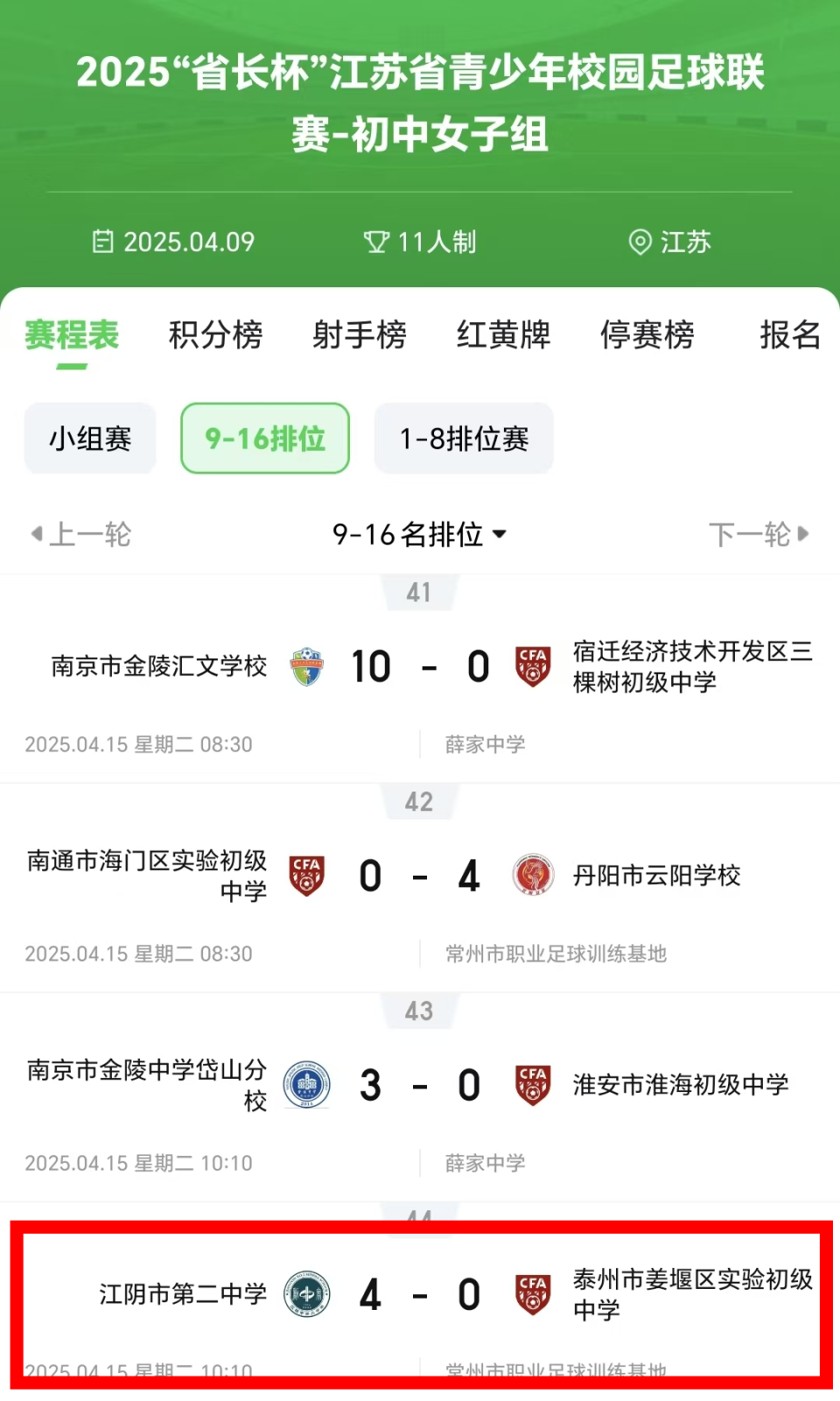 泰州的姜堰实验初中,则参加了省长杯初中女子组。小组赛期间1胜3负排在小组第四;9-16名排位赛,4球完败江阴二中。