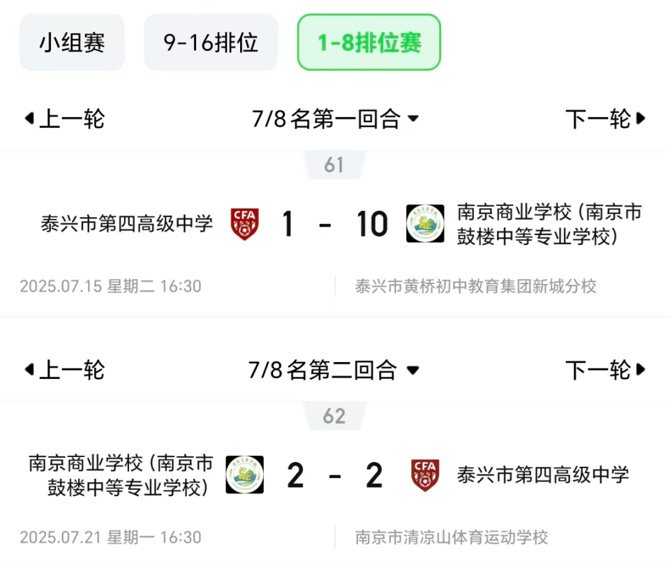 在最后的7到8名排位赛,第一回合1比10惨败南京商业学校,第二回合双方2比2战平,最终泰兴四高排在第8名。