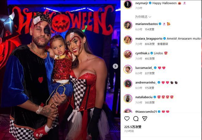 北京时间11月3日,内马尔分享了自己和女友布鲁娜以及两人的女儿一起过万圣节的装扮照片。