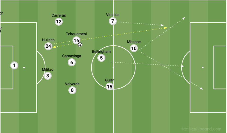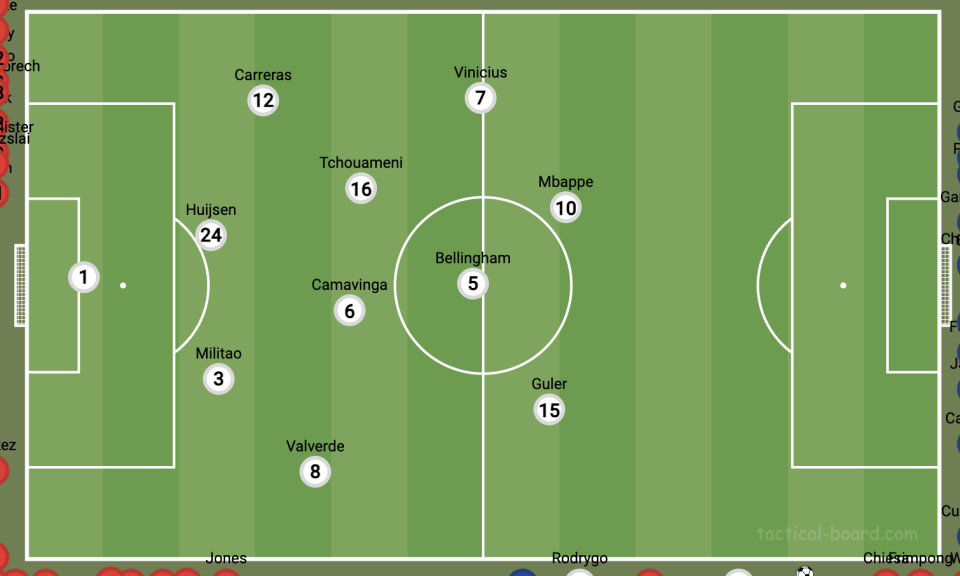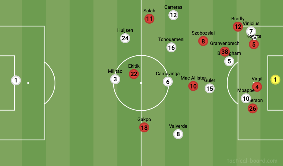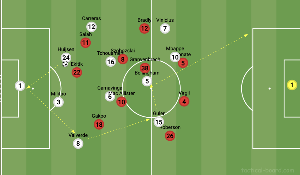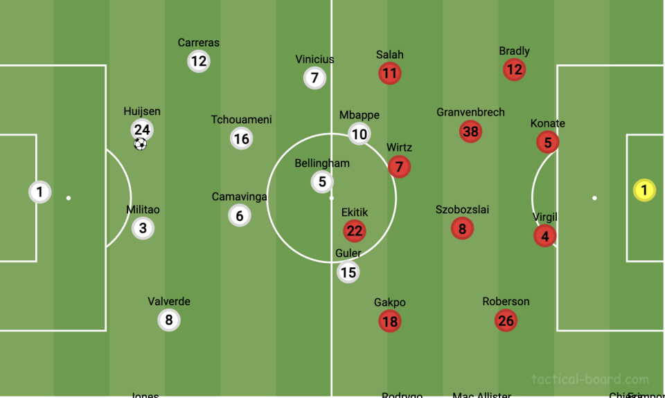 但是卡瓦哈尔受伤反而有个好处就是,巴尔韦德成为右后卫的首选,这几乎和利物浦对同样全能的索博斯洛伊的用法极其类似,也是命中注定了。巴尔韦德其实是个非常全面的球员,他首发右后卫能提供比卡瓦哈尔更多的进攻选择的同时,防守还不太落下风:比方说,他既能够下底套边传中,也能在防守一区和进攻二区发动斜向角度往左路强侧的转移,他的组织和出球精度也比较高,传球渗透性较为强,硬要说缺点的话,就是因为这是他后期加点出来的技能点,传的长距离传球以直球为主,缺乏内旋的转速,导致有时候容易传大,队友不好停和不好接。但是这可边可中的进攻手段其实是一个大杀器,关键看看阿隆索会怎么运用。主教练阿隆索其实是一个「兵无常势,水无长形」的风格,这点他和其过去的老师安切洛蒂一样,不拘于一种战术风格和一种常规阵型。在入主皇马之后打过433,4141,4231,3421多个不同的阵型。考虑到皇马较为擅长的打法,我个人预测的皇马首发有可能是和对阵巴塞罗那的比赛类似:是一种类4231的起手阵,首发琼阿梅尼和卡马文加最大的要点,其实就是遏制住利物浦主打右路的进攻,让琼阿梅尼和卡雷拉斯协防萨拉赫和索博斯洛伊的配合。在中场进攻二区大幅搅乱利物浦的进攻组织和出球,特别是利物浦在这个赛季,在右路丢失球权特别多,特别容易被直上直下地打法所克制:这种堆绞肉机换空间和节奏的玩法,在过去英超利物浦连败的几场里被各大球队纷纷利用,水晶宫是最早这么玩的,针对转换其实利物浦在右路的防守特别薄弱——特别是在格拉芬贝赫被抽调上去支援法老之后。除此之外,利物浦这赛季还丢掉了关键的高位转换能力,前场压迫体系发挥的最好的,只有刚刚过去对阵维拉的比赛,但是也拼得索博和萨拉赫体能枯竭,这场比赛能不能继续保持这样的反抢和高位效率,利物浦是存疑的。所以进攻阶段,皇马由于在客场,阿隆索很大概率会用这样的安排:中场抢下球之后,回做给赫伊森拉开传球角度之后,由赫伊森迅速打利物浦最痛的右侧进行反击,前场的跑位当中,维尼修斯可以自己持球和姆巴佩交叉换位在禁区弧顶射门,也可以姆巴佩跑后点,贝林跑前点,居莱尔跑中路大弧顶打倒三角传中:其实现在范戴克下滑很多,由于速度下降,很多关键的预判和防守行为会受限于这具衰老的身体而出现失误——此前的送点就是身体跟不上脑子的典型。只要姆巴佩会跑后点,那么不管利物浦首发是罗伯逊还是科尔克兹,在面对姆巴佩在后点绕盲区包抄都会比较吃力。这种高节奏转换对于利物浦来说是非常难受的,赫伊森本身的传球水平相当高,左路的后场Build Up的关键人还是得看赫伊森。另外在这种情况下,如果后场赫伊森Build Up遇到利物浦的压迫出不了球的情况下,那么皇马还有另外一个可以发起进攻的点,巴尔韦德和居莱尔连线,由于加克波的大身体模型,反抢当中只要一个防守到位率没跟上,巴尔韦德这一侧就有可能直接找到居莱尔、姆巴佩、维尼修斯的防守一区到进攻三区的推进。但是由于居莱尔增肌导致降速,最终球还是会往左路发展,右路的巴尔韦德插上更多是拉开利物浦防线宽度,给中路制造机会的策应性跑动,来打进攻三区的阵地战。所以皇马客场进攻的关键点在于转换的效率,这也是从穆里尼奥时代开始就刻在皇马基因里的东西。对于利物浦来说,情况就稍微复杂一点,按照首发来排的话,很大概率是这样:继续延续上一场对阵维拉胜利的首发,但是这里有个很大的问题在于,比赛之间的间歇短,恢复期少,面临到的很可能是能不能维持高强度比赛节奏的体能问题。我们从上一场对阵维拉的比赛80分钟以后已经看到法老和索博有力竭的情况出现,斯洛特肯定是知道赫伊森这个进攻发动机的问题,也会对赫伊森具体地压迫和布置,但是是否能执行到位,关键还是看萨拉赫和索博斯洛伊的体能和战术执行力。当然,索博是没有问题,但是利物浦两边的跑动量确实是存在着较大的问题,加克波的大身板和体重,导致运动能力不高,防守到位率低,一旦比赛强度过高,体能分配就会成为问题,失误也会随之增多。利物浦本赛季抛开联赛杯和社区盾杯,在75分钟后的丢球已经来到了7个,占所有丢球的一半,这种很多都是下半场体能不够导致精神不集中的具体表现。所以斯洛特很大概率会先选择抢开局的形式拿下一两个进球,然后再进行换人来保持压迫强度,利物浦的进攻其实变化并不多,不上维尔茨的情况下,其实利物浦能创造出来的进攻机会是有限的,但是上了维尔茨,利物浦的防守就会出现问题。所以这场比赛,为了有足够的后手,斯洛特有可能先发维尔茨,针对皇马的问题来先打一个,皇马的问题很简单,但是并非处理不了,这个问题在于防空。赫伊森本身的防空能力,在190cm+中卫里其实不算特别出色,主要是缺乏对长距离冲顶的预判不足,而皇马另外一名中卫米利唐由于身高,防空能力更差。所以利物浦在进攻手段缺乏的情况下,很大概率会通过萨拉赫在45°角斜传中的方式,让加克波和埃基蒂克去顶作为自己的有效进攻手段——毕竟加克波也是190cm+,头球不错的一个非传统逆足边锋。能不能打破僵局,关键在于法老到底是延续维拉那场的表现复苏,还是继续像过去几个月一样萎靡,因为如果法老拿不住球,丢失球权的情况下,利物浦的反抢和防守其实是个问题。斯洛特也很大