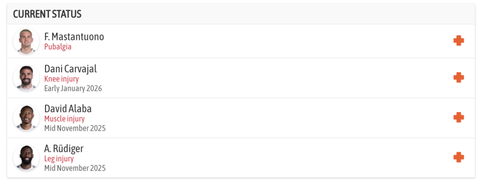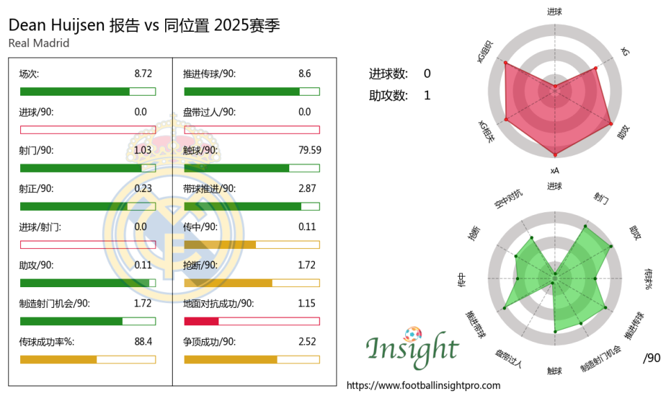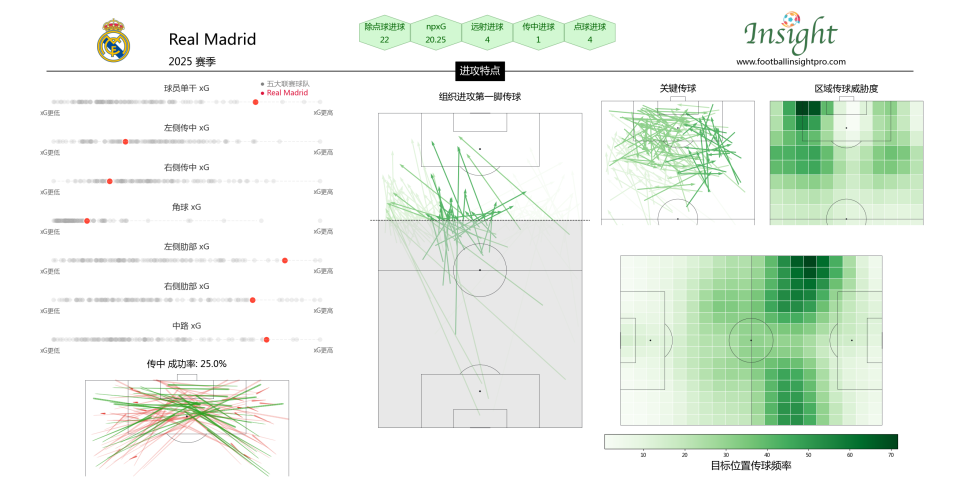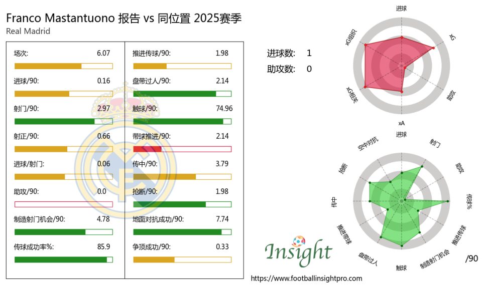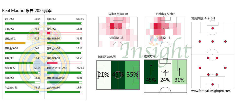 今晚是欧战小组赛利物浦主场对阵皇马的比赛,由于有读者朋友感兴趣,我就写个提前前瞻,大概聊聊双方比赛一些核心的点。(今天有两篇内容,第二篇是朋友写的桑德兰战术分析,感兴趣可以移步前往)对于皇马来说,赛前的消息大多都是不利的,马斯坦多诺伤了,卡瓦哈尔又双叒叕大修,吕迪格还没康复,特伦特紧急复出,目前情况来说,皇马遇到的大部分问题,其实和此前的一个赛季类似——防线伤病。但是比安切洛蒂那会儿背得实在没办法的要好一点的是,起码米利唐和赫伊森是能掏得出来成为首发的,替补席还坐着一个阿森西奥。而马斯坦多诺在右路能给到的比赛贡献,其实十分有限,他的缺阵与否对于阿隆索来说其实并不关键。这里稍微聊一下马斯坦多诺,这个孩子和大部分标签为「阿根廷人」的球员差不多,在底盘的精细处理球能力方面确实有过人之处,而且也很敢拼敢抢,具有战斗精神,这些都是优点。作为皇马的主力首发逆足右边锋,一对一和狭小空间处理球可以依靠他的战斗精神对抗,以及细致地处理球能力在右侧肋部效果比较好,但是马斯坦多诺的冲刺速度其实相对较为有限,如果给他安排在弱侧大空间,他的持球推进能力和冲刺速度有部分情况会导致被回追卡住空间和位置,而弱侧天然少队友支援,球也很难以传出来,只能被迫单干,或者横向带球到中路打配合,最后导致反击降速:事实上,皇马大部分的右边锋其实都有「无法成为弱侧」的问题,马斯坦多诺如此,居莱尔、罗德里戈等放在右路也如此。而马斯坦多诺其实和居莱尔的模型是有点像的,二人比起爆点硬突的边锋,更适合作为一个肋部前腰来使用,特别在居莱尔增重了之后,原本10-11的摇摆位,现在有了对抗固定在10号位,马斯坦多诺本来对抗就超越了他这个年龄很多,要是练练传射,也有可能能作为10号位。所以皇马到目前为止,右路的进攻问题其实还是没有得到解决:相较于马斯坦多诺的受伤,皇马其实受到的影响并不算太大,右路该是瘸子还是瘸子,其实新赛季卡瓦哈尔由于年龄和伤病隐患,已经极少插到对方底线来拉开进攻宽度了,右边的进攻天然缺乏进攻宽度,只能走内线是目前皇马的最大问题。
