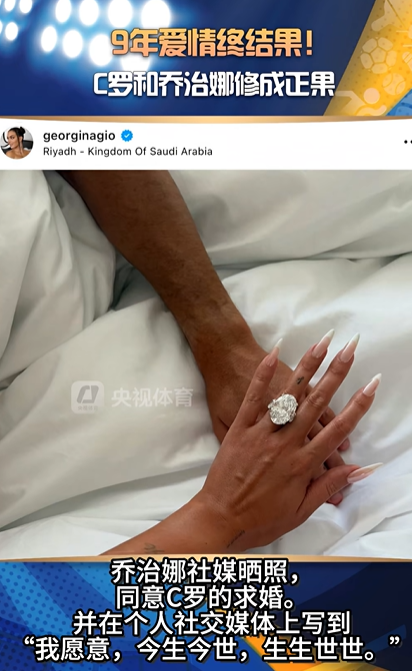 照片中,乔治娜手戴戒指与C罗手牵手,并写道:“是的,我愿意。在此生以及我所有的生命中。”