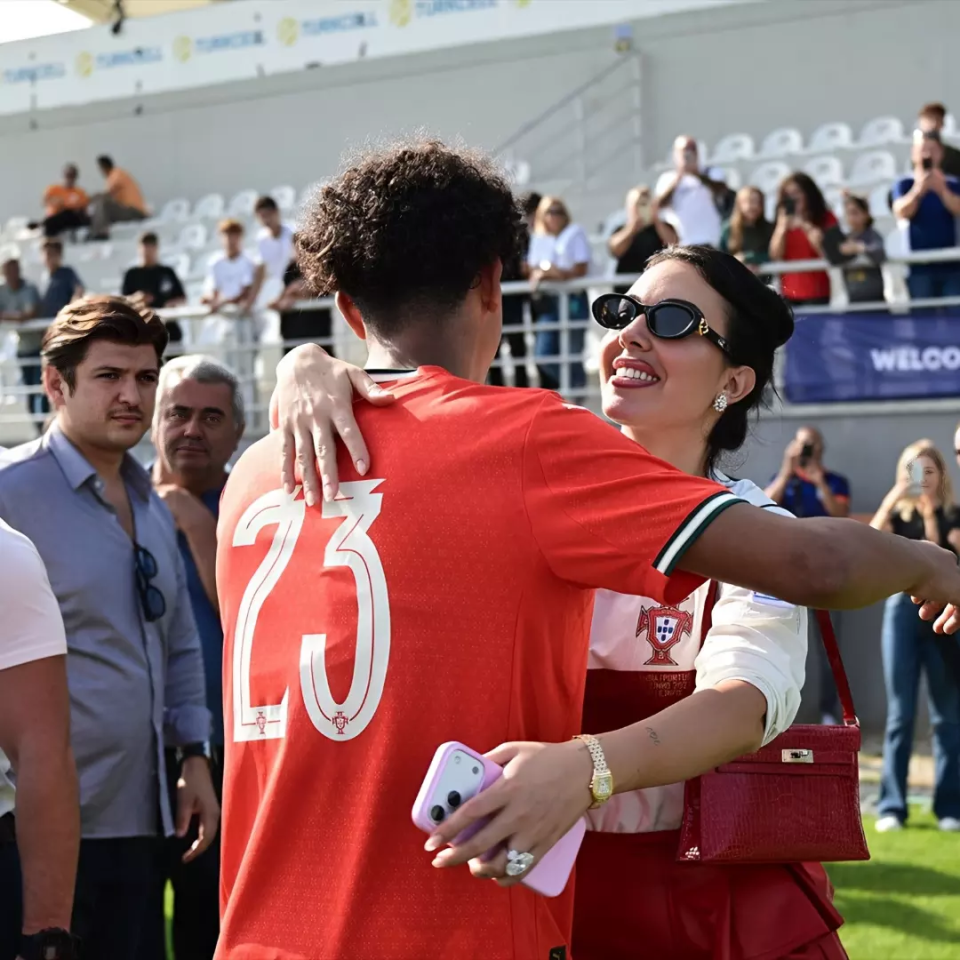 在和迷你罗合影时,乔治娜绽放出灿烂的笑容,颇有“骄傲妈妈”的感觉。当天这位已经跻身世界名媛行列的前柜姐,穿着葡萄牙国家队的长袖队服,搭配了一条略显夸张的猩红色皮裙,显然无论何时乔治娜都没有放弃展示曼妙的身姿。