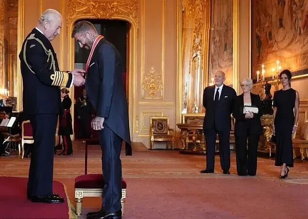 小贝单膝跪地,被查尔斯国王用剑轻点双肩,随后查尔斯为他戴上KBE勋章…