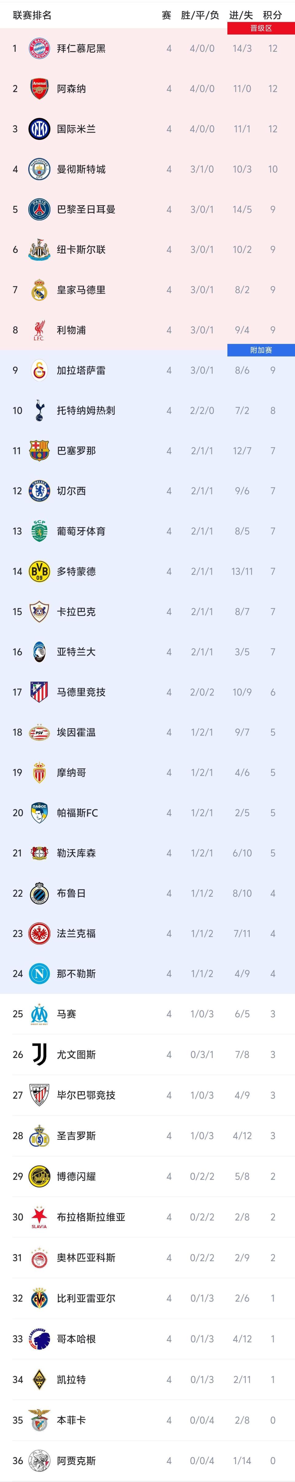 相比西甲,参加欧冠的英超6队表现相当抢眼。本轮保持不败并且5队取胜。其中阿森纳、曼城、纽卡和利物浦还处于前8名的直通区。热刺和切尔西则分别排名第10位和第12位,西甲本赛季在欧冠的表现,确实要被英超碾压。
