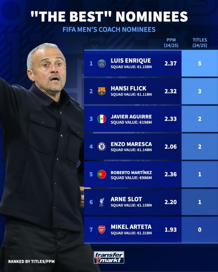 FIFA公布年度最佳男足教练候选名单后,德国转会市场列出了入围者上赛季的成绩。