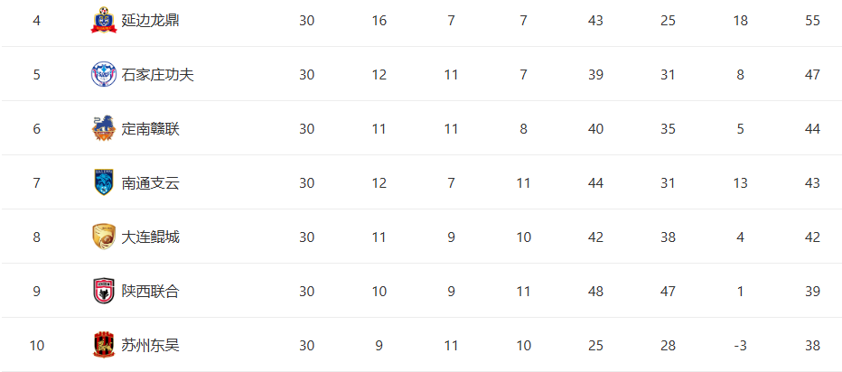 最后让我们再来看一下本赛季中甲最终的积分榜情况。