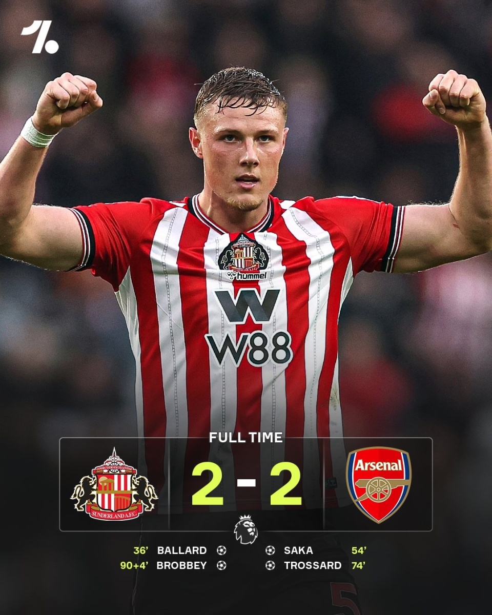 阿森纳客场2-2战平桑德兰,各项赛事10连胜势头被终结,暂以7分优势领跑英超。巴拉德破门首开纪录,梅里诺助攻萨卡扳平,苏维门迪击中横梁,特罗萨德世界波反超,布罗比补时绝平。