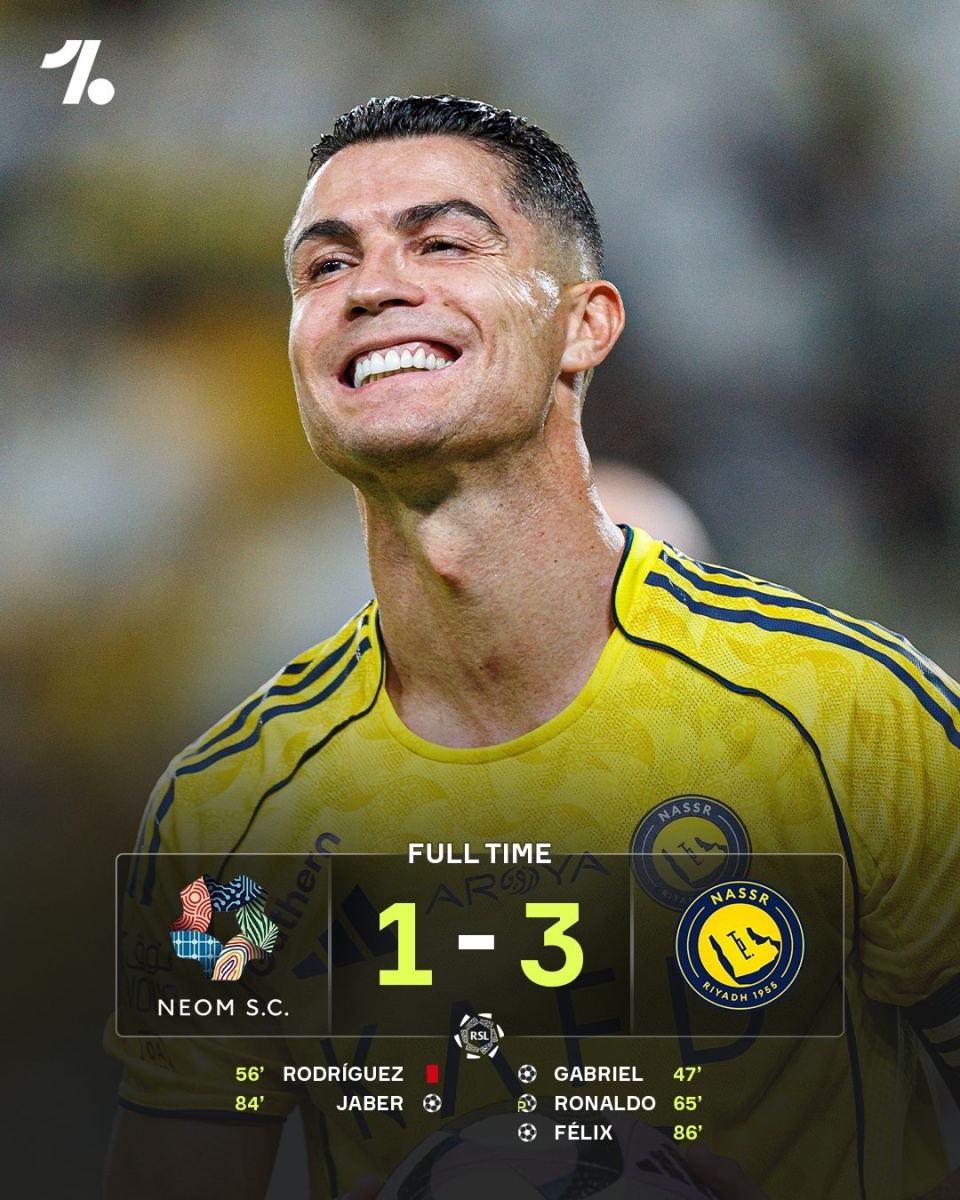 沙特联第8轮,利雅得胜利3-1新未来城体育,8连胜积24分继续领跑积分榜,马内失单刀,拉卡泽特伤退,菲利克斯失良机,安吉洛贴地斩,罗德里格斯恶犯直红,C罗点射,打入沙特联100球,贾伯扳回一球,菲利克斯远射建功。