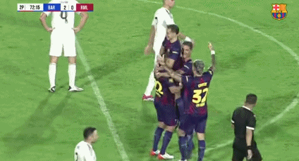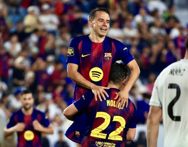 萨维奥拉梅开二度,巴萨传奇队友将“兔子”一把抱起庆祝。