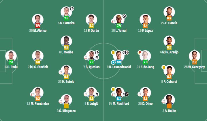 巴塞罗那(4-2-3-1):什琴斯尼;埃里克-加西亚,阿劳霍,库巴西,巴尔德(86'赫拉德-马丁);费尔明,德容,奥尔莫(86'克里斯滕森);亚马尔(95'贝尔纳尔),莱万多夫斯基,拉什福德(88'费兰-托雷斯)