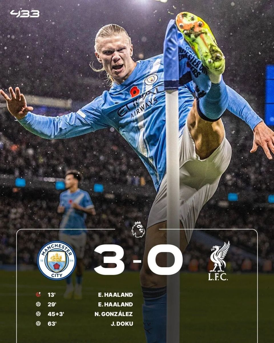 错失点球的哈兰德在第28分钟将功补过,努内斯传中,哈兰德头球破门,曼城领先。