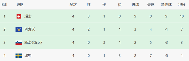 瑞士10分,科索沃7分。接下来2场世预赛,瑞士主场迎战瑞典,客场挑战科索沃,主动权掌握在自己手上。如果瑞士赢球,科索沃不胜,瑞士将提前出线。