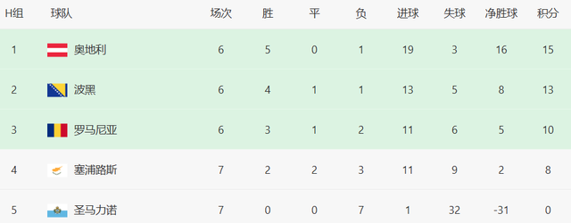 奥地利15分,波黑13分。15日的比赛,奥地利客战塞浦路斯,波黑vs罗马尼亚,如果奥地利赢球,波黑不胜的话,奥地利将提前锁定小组第1出线。