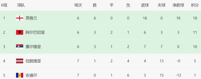 英格兰6战18分已经提前出线,是第1支直通2026世界杯的欧洲球队。