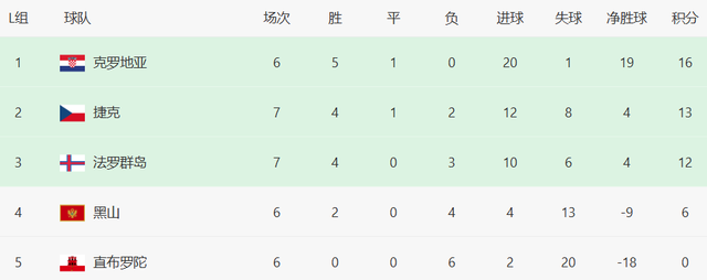 克罗地亚6场16分,捷克7场13分。14日的比赛,莫德里奇领衔的克罗地亚,只要战胜法罗群岛,就能提前晋级世界杯。
