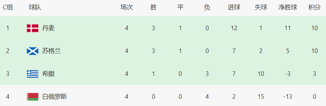 丹麦、苏格兰均是10分,都有机会夺得小组第1名。11月18日,两队将直接交锋,真正的一战定生死。