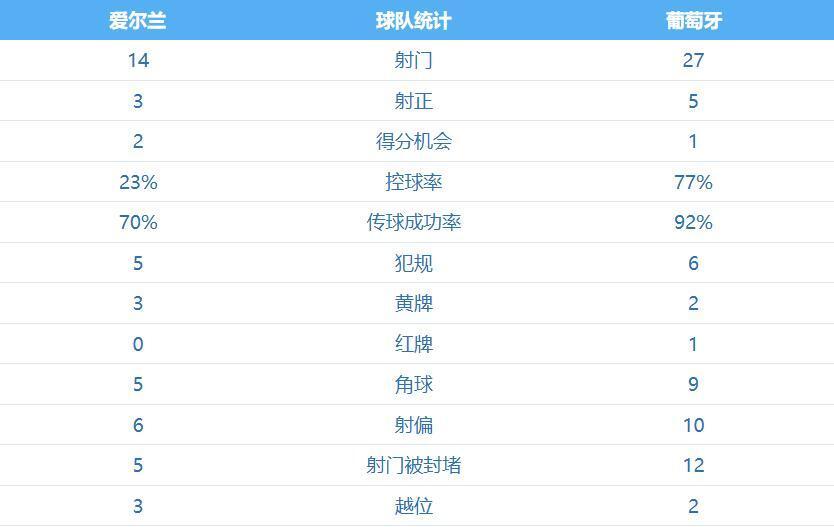 最终,葡萄牙0-2客负爱尔兰,无缘提前出线。积分榜方面,葡萄牙积10分领跑,爱尔兰积7分排名第三。
