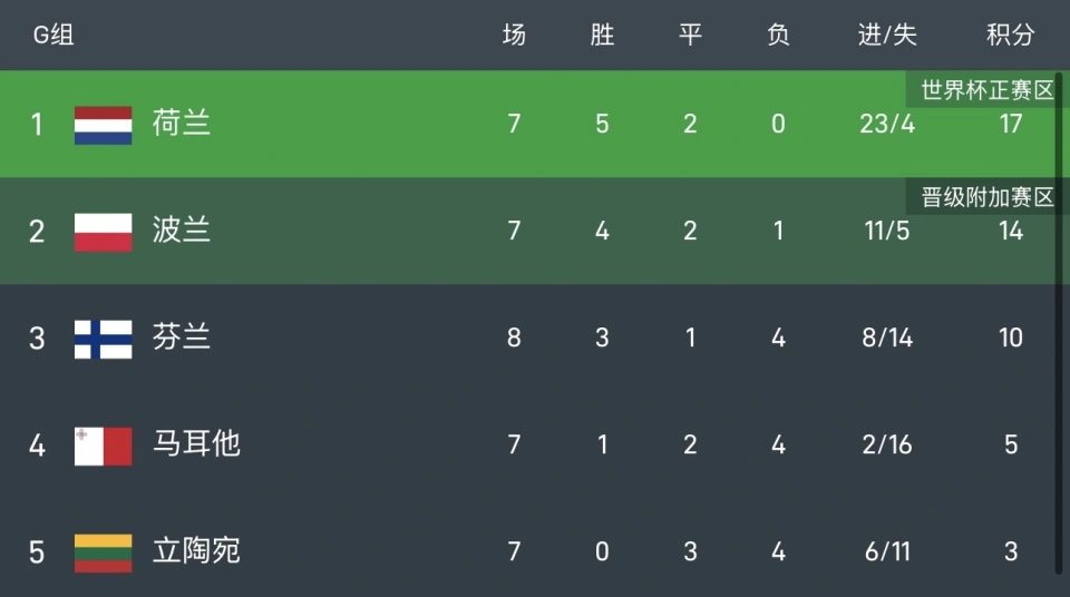 荷兰领先波兰3分+13个净胜球,最后一轮主场对阵立陶宛,打平就能出线;即便输球,只要波兰无法以大比分击败马耳他,荷兰也能直通世界杯。芬兰10分,马耳他5分,立陶宛3分,全部出局。