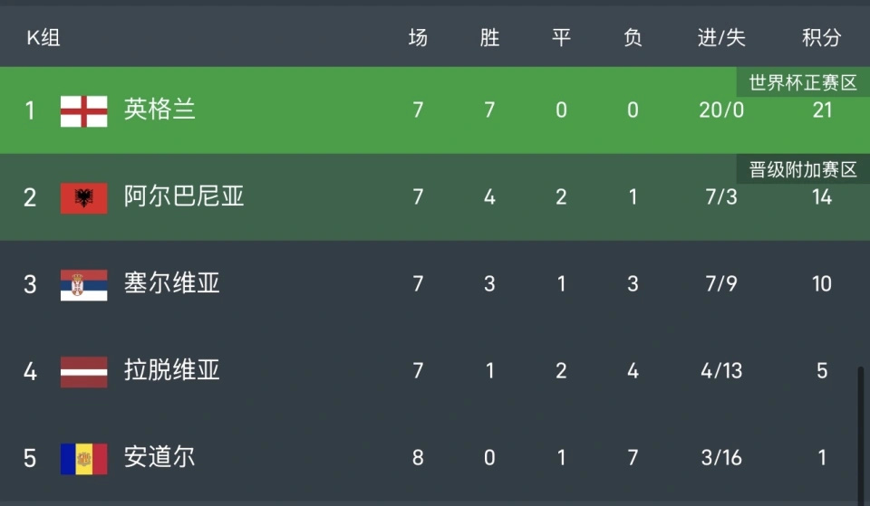 英格兰7战全胜已经提前出线,阿尔巴尼亚14分锁定小组第二,获得附加赛资格,塞尔维亚10分,拉脱维亚5分,安道尔1分,全部出局。