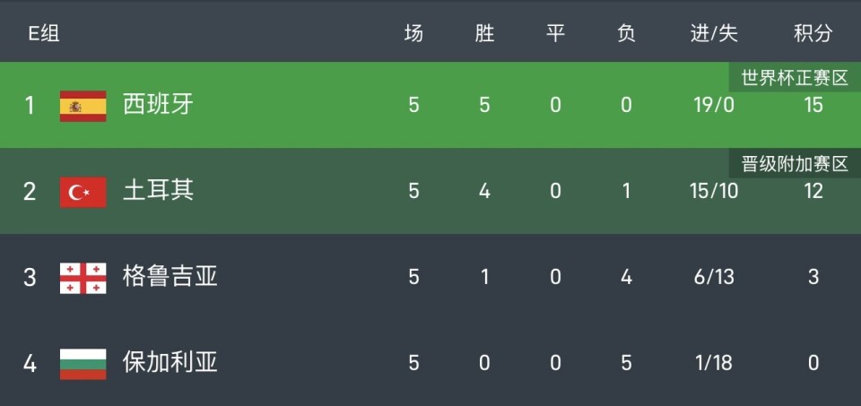 西班牙15分,领先第二名土耳其3分+14个净胜球,最后一轮两队直接交锋,西班牙只要不输0-7肯定出线。格鲁吉亚3分,保加利亚0分,双双出局。