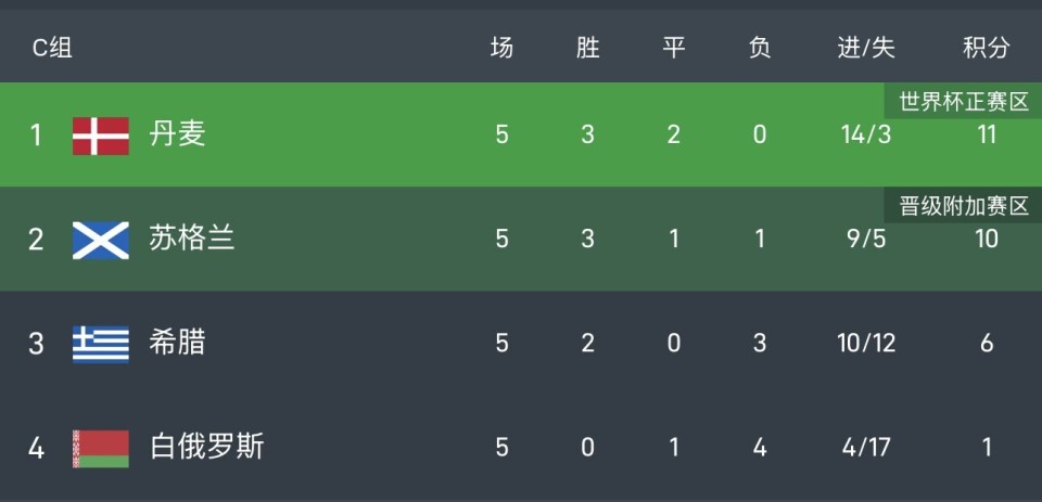 丹麦11分,苏格兰10分,两队最后一轮直接交锋,丹麦打平就出线,苏格兰想出线必须主场取胜,否则就踢附加赛。希腊6分,白俄罗斯1分,双双出局。