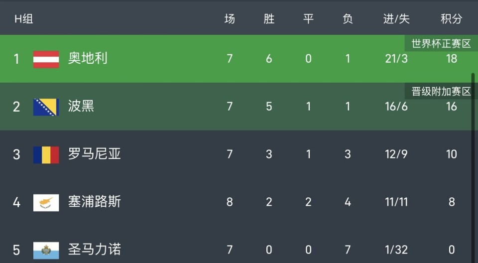 奥地利18分,波黑16分,最后一轮两队直接交锋,奥地利打平就出线,波黑想出线必须赢。罗马尼亚10分,但通过欧国联席位拿到附加赛资格,塞浦路斯8分,圣马力诺0分,双双出局。