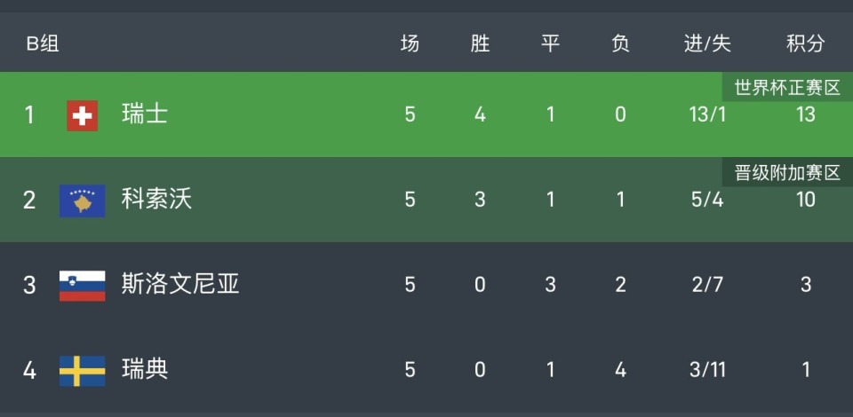 瑞士13分,领先第二名科索沃3分+11个净胜球,两队最后一轮直接交手,瑞士打平肯定出线,科索沃想要出线,至少得赢6-0。斯洛文尼亚3分出局,瑞典1分垫底,但仍有可能通过欧国联获得附加赛席位。