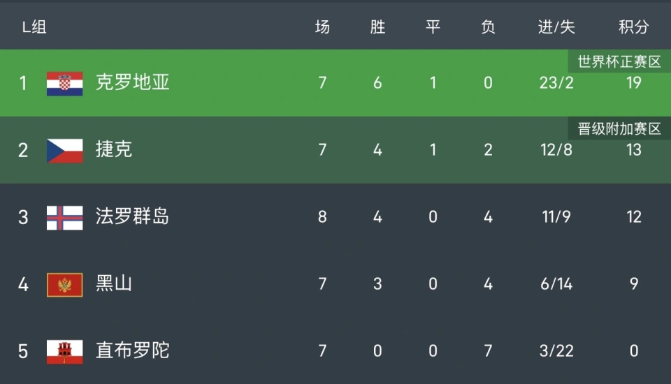 克罗地亚6胜1平提前一轮出线,直通世界杯。捷克13分锁定小组第二,拿到附加赛资格。法罗群岛12分,黑山9分,直布罗陀0分,全部出局。