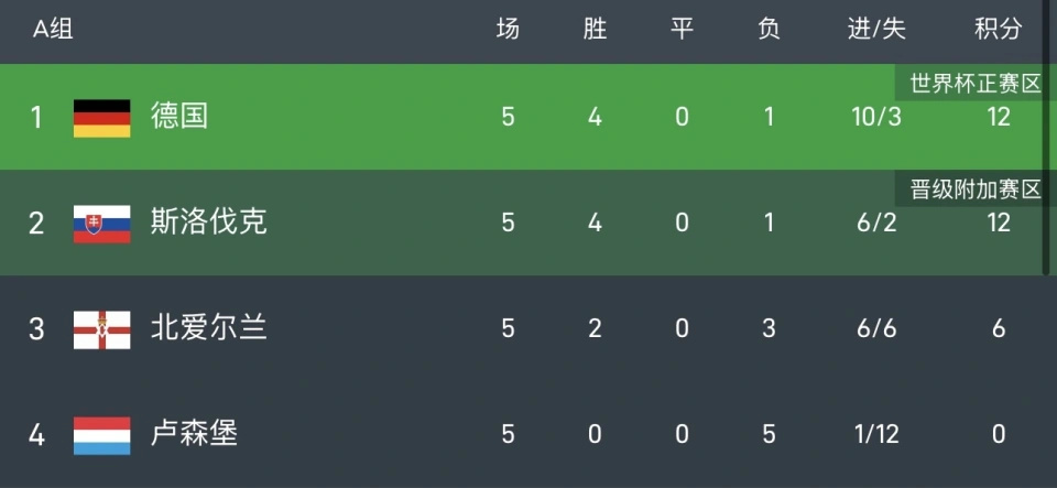 德国和斯洛伐克同积12分,但多了3个净胜球。最后一轮,两队直接交锋,德国只要主场打平就能直通世界杯,输球则将参加附加赛,斯洛伐克直通。北爱尔兰6分,仍有可能通过欧国联获得附加赛席位,卢森堡0分出局。