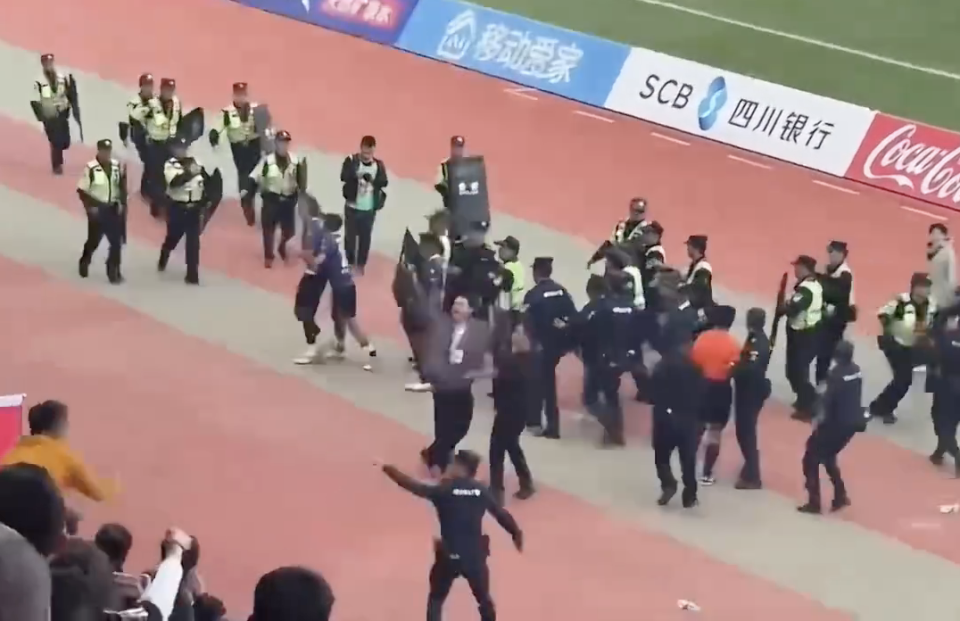 凉山的球员和球迷都觉得主裁判的哨子不公平。当主裁判离开球场并准备走入球员通道的时候,一位凉山的球员忽然跑了出来,腾空而起,飞踹主裁判。随后,安保人员立刻介入,将该球员控制住,并保护住主裁判。