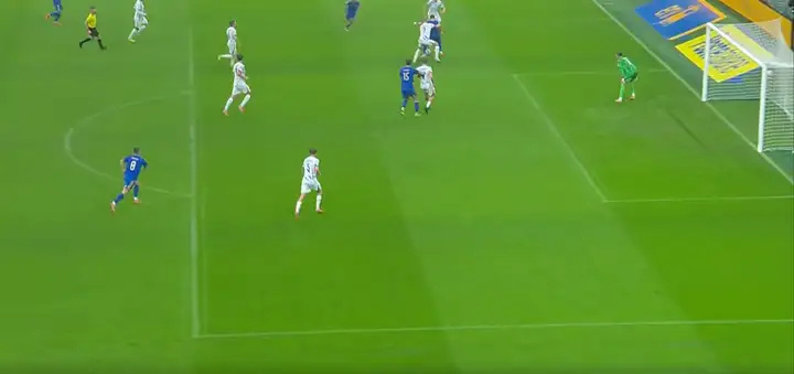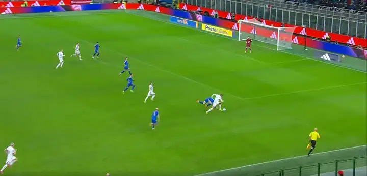 上图这个镜头,可以代表意大利队正常的颓势。面对索尔洛特、努萨还有哈兰德的冲击,意大利的球员对抗很吃亏,经常是被对手撞得东倒西歪,身体硬度、速度频率完全不在一个档次。