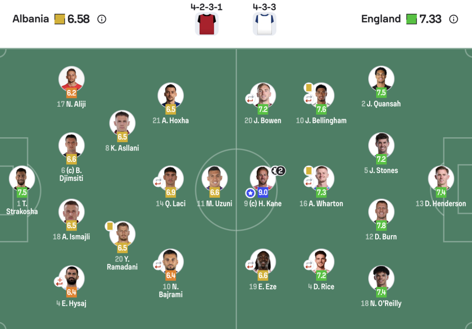 英格兰(433):13-迪恩-亨德森;2-宽萨,5-斯通斯,12-伯恩,18-奥赖利;10-贝林厄姆(84’15-罗杰斯),16-沃顿(75’21-安德森),4-赖斯(62’17-福登);20-鲍文(75’11-拉什福德),9-凯恩,19-埃泽
