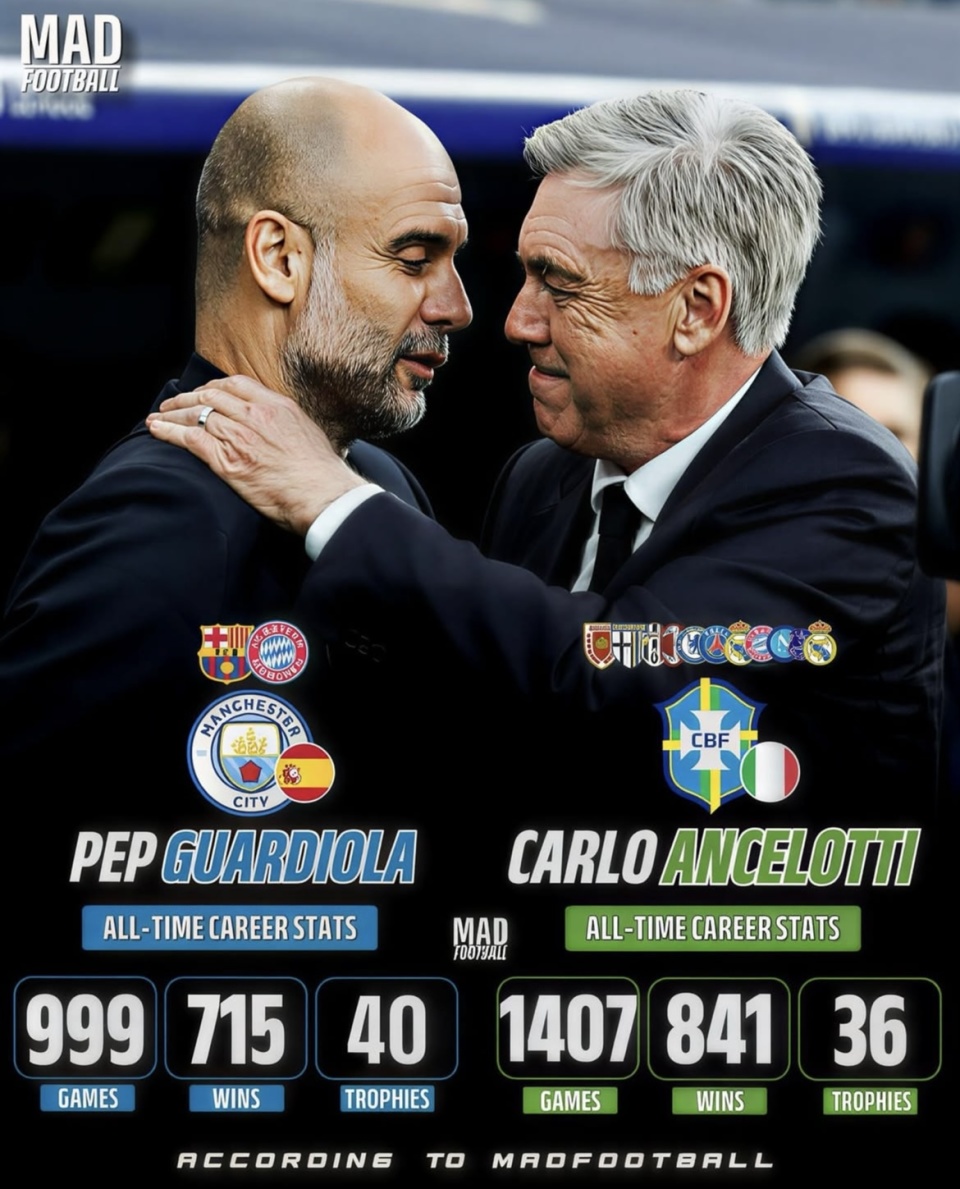最近MADFOOTBALL发布了一组瓜迪奥拉和安切洛蒂的执教数据对比,并在社交平台发起投票。