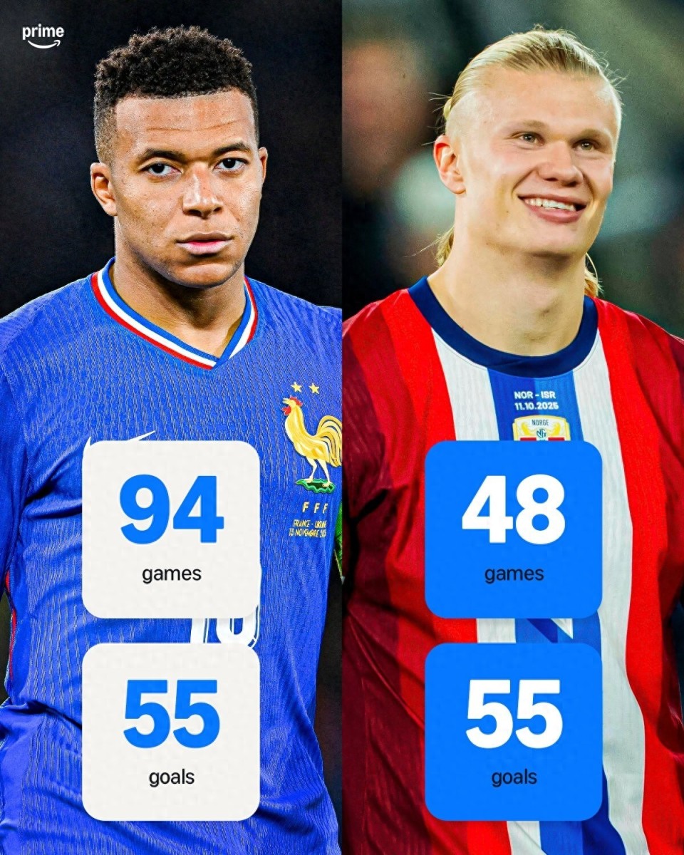 新双骄国家队进球数:哈兰德55球追平姆巴佩 所需场次仅一半