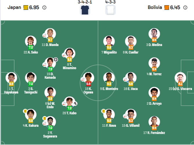 玻利维亚出场阵容:23-维斯卡拉;17-罗贝托、2-阿罗约、4-托雷兹、3-梅迪纳;15-维拉米尔、16-巴卡(46’14-马特乌斯)、6-库埃拉尔;11-纳瓦、9-蒙泰罗、7-特塞罗斯
