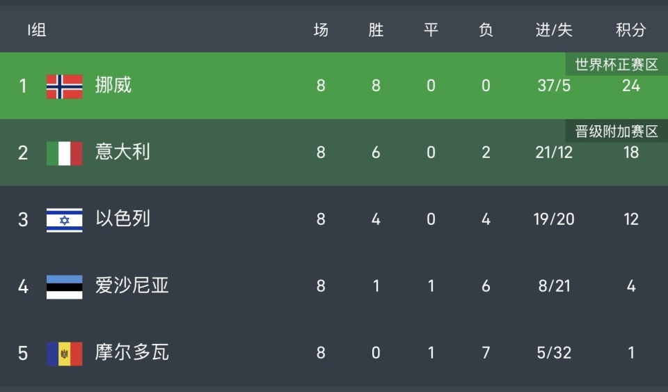 挪威8战全胜24分小组第一,时隔28年重返世界杯。意大利18分小组第二,连续三届踢附加赛。以色列12分,爱沙尼亚4分,摩尔多瓦1分,全部出局。