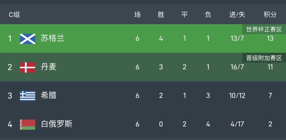 苏格兰13分小组第一,时隔28年重返世界杯。丹麦11分小组第二,拿到附加赛资格。希腊7分,白俄罗斯2分,全部出局。