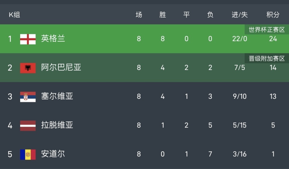 提前出线的英格兰8战全胜24分,阿尔巴尼亚14分提前锁定附加赛。塞尔维亚13分,拉脱维亚5分,安道尔1分,都已经提前出局。