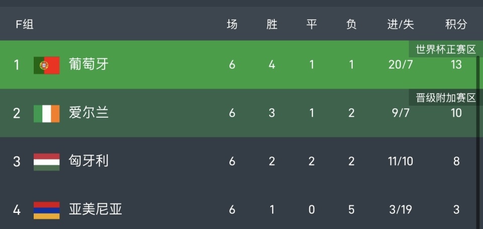 葡萄牙13分小组第一直通世界杯,爱尔兰10分小组第二,锁定附加赛资格。匈牙利8分,亚美尼亚3分,双双出局。
