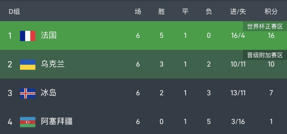 法国16分已经提前出线,小组第一直通世界杯。乌克兰10分小组第二,获得附加赛资格。冰岛7分,阿塞拜疆1分,双双出局。