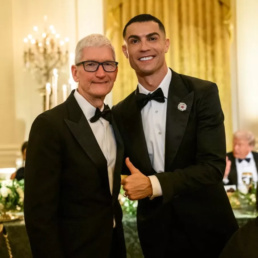 C罗也跟苹果CEO蒂姆·库克在晚宴上合影,而特朗普也是一不小心出镜了。