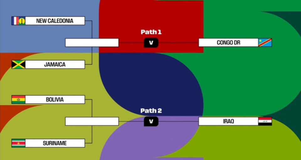 因为民主刚果和伊拉克世界排名更高;所以2队直接进入了决赛;其他4队将进行2场半决赛,胜者与两支种子队进行单场淘汰赛,直接争夺最后两个世界杯席位。