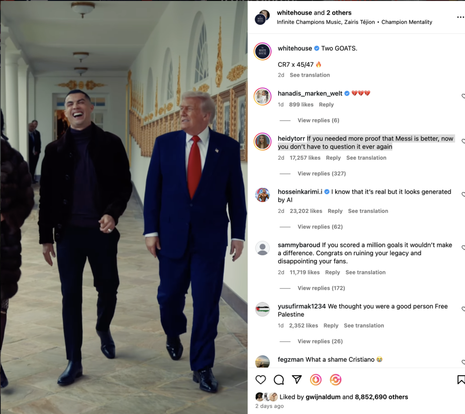 第三,C罗不仅成为沙特外交工具,还成为特朗普宣传工具。见面会白宫方面发了一张宣传图:two goats。在这张图下面涌入愤怒的球迷,纷纷攻击C罗毁了自己的名声。