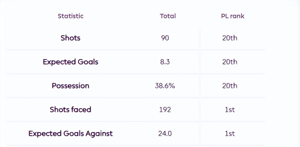 伯恩利在过去六轮英超中有五场被对手攻入至少两球。而整个赛季,斯科特·帕克的球队在多项关键数据上排名垫底:射门最少、xG(预期进球)最低、控球率最低、被射门最多、xGA(预期失球)最高。