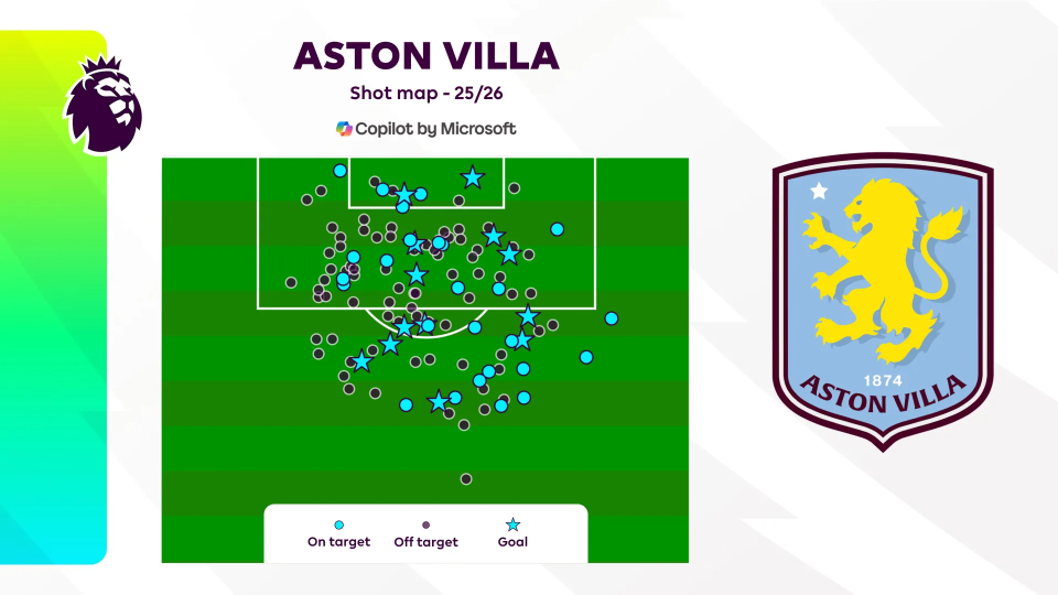 本赛季只有伯恩利的xG比维拉更低(维拉:9.36)。13个进球中有7个(占54%)来自禁区外,包括上轮对伯恩茅斯的两粒关键远射。