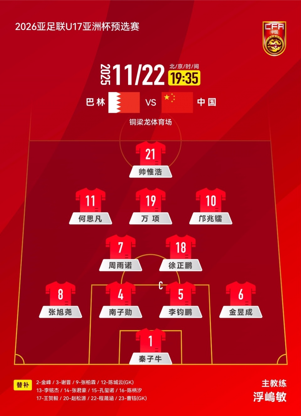 北京时间11月22日19点35分,U17亚洲杯预选赛A组首轮一场焦点战打响,中国U17男足将在铜梁龙体育场迎战首个对手巴林队。而本场比赛双方的首发阵容,也已经出炉。