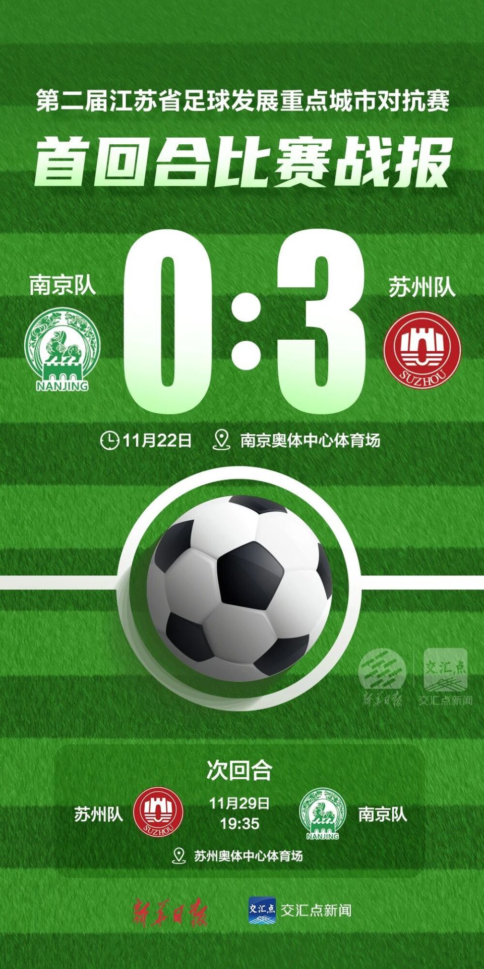 “苏超”余温未散,绿茵战火再燃!11月22日晚,第二届江苏省足球发展重点城市对抗赛首回合比赛在南京奥体中心拉开帷幕,经过90分钟激烈角逐,客场作战的苏州队凭借高效进攻以3:0战胜南京队。