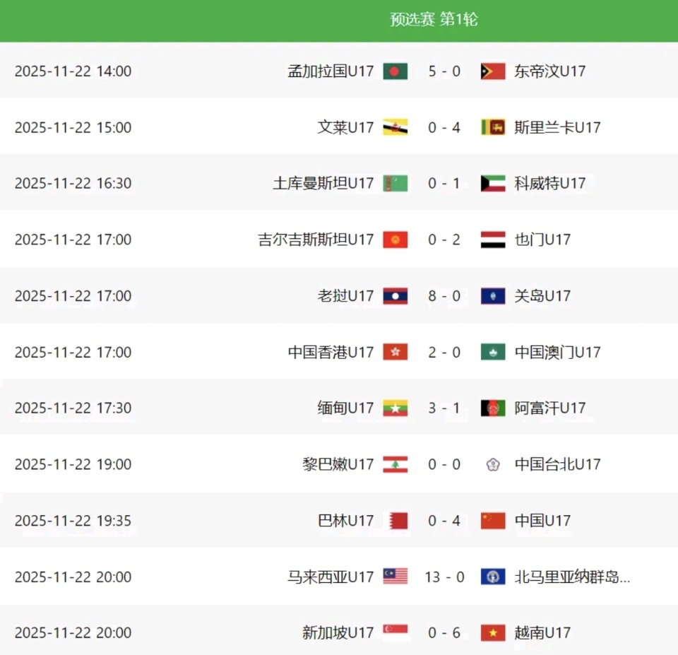 北京时间11月23日,U17亚洲杯预选赛首轮比赛昨晚全面打响。中国U17男足在主场4-0大胜巴林队,为冲击明年在沙特阿拉伯举行的U17亚洲杯正赛开了个好头。