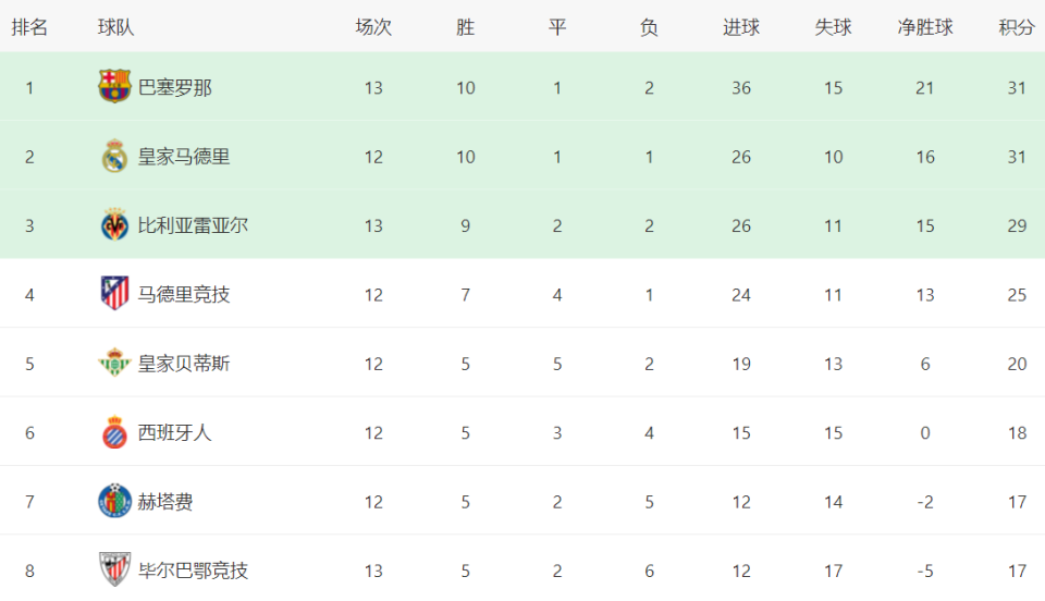 在积分榜上,巴萨暂时超越皇马登顶。巴萨10胜1平2负,拿到31分。皇马也是31分,但是净胜球比巴萨少,只能排名第2。不过,皇马比巴萨少踢1场,接下来有机会重新登顶。比利亚雷亚尔以29分排名第3,与巴萨皇马的差距很小。马竞以25分排名第4。第5的是皇家贝蒂斯,拿到了20分。西班牙人以18分排名第6。赫塔费和毕尔巴鄂竞技都是17分。塞维利亚和皇家社会只拿到16分。